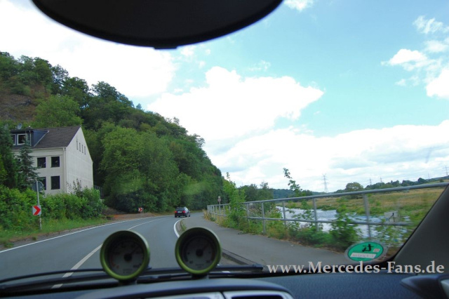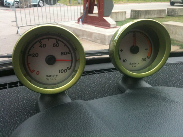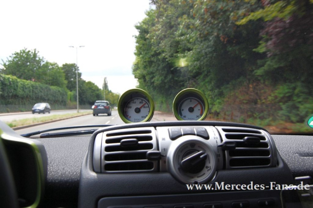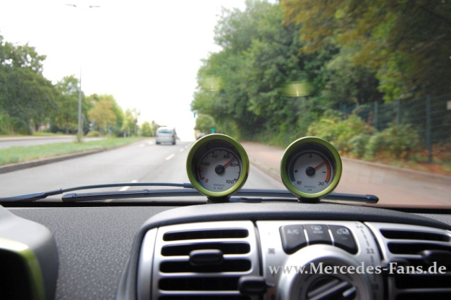 Liegts nun an der inneren Anspannung oder Neugierde oder hab ich was falsch gemacht? Das Auto läuft nicht. Doch es läuft, nur hör ich nichts. Der smart ED wird wie jedes andere Automatik-Auto auch in Stellung P gestartet und ist umgehend aktiviert. Man sieht es am linken der beidem auf dem Armaturenbrett positionierten Rundarmaturen. Rund 90 % Ladekapazität zeigt es an. Also sind 75 km ein absoluter Klacks. Aber ein Startgeräusch würde ich mir dennoch wünschen. So wie bei einer Digitalkamera das Geräusch des mechanisches Verschlusses zu hören ist, würde ich hier gern ein Startgeräusch hören. Und als Ergänzung fände ich auch nicht schlecht, wenn mir ein grünes LED signalisiert: Ich bin jetzt scharf geschaltet und ready for action! Mit leisem Sirren gehts nun voran.