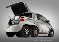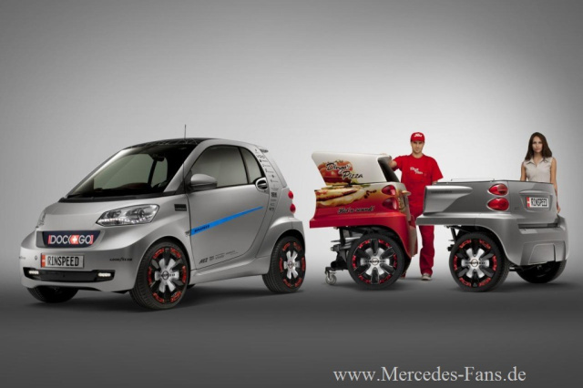 Bilder und Film verdeutlichen anschaulich das neu erdachte Mobilitätskonzept, das aus einem Elektro-Auto und diversen einachsigen so genannten "Packs" besteht. Unterschiedliche "Packs" - mal für die Arbeit, mal für die Familie, mal für die Freizeit - machen selbst aus dem kleinsten E-Auto ein flexibles MPV mit drei Achsen und vielen Einsatzmöglichkeiten. Rinspeed dachte aber nicht nur über eine maximale Variabilität des "Dock + Go" nach. Ihm kam es auch auf eine Verlängerung der Reichweite des Wagens - hier ein smart electric drive mit einem Serien-Aktionsradius von rund 120 Kilometern - an.