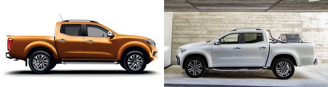 Von der Seite betrachtet, ist die Verwandschaft zwischen Nissan Navara und Mercedes X-Klasse recht eindeutig. Die Radläufe der X-Klasse sind aber weniger bauchig bzw. wulstig gestaltet. Das Design des Mercedes-Benz Pickup-Flanke wirkt insgesamt ruhiger, gradliniger und wohltuend reduziert ohne dabei Langeweile auszulösen.
