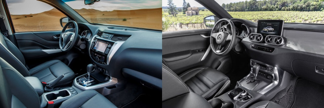 31.110 € kostet der Nissan Navara VISIA als Double Cab 4x2 2.3 l dCi (163 PS). Der Einstiegspreis in Deutschland für die X-Klasse ist mit 37.294 € angegeben. Die Ausstattung der Arbeitsbiene Visia ist allerdings eher karg und puristisch. Großartige Komfortausstattung und Assistenzsysteme sind hier nicht an Bord. Das Interieur des Navara generell wirkt reichlich spröde. Gediegener Pkw-Standard erwartet den Navara-Fahrer. Begeisterung für innere Werte wird hier nicht so schnell geweckt. Da hat die X-Klasse aber einiges mehr zu bieten. Das Mercedes-spezifische Cockpit mit großem Zierelement, runden Lüftungsdüsen und freistehendem Zentraldisplay strahlt bereits durch seine klare Gestaltung Hochwertigkeit und modernen Luxus aus. Das Kombiinstrument in der X-Klasse besteht aus den großen, analogen Rundinstrumenten der C-Klasse und V-Klasse. Bei der X-Klasse PROGRESSIVE und POWER sind sie tubenförmig ausgeführt. Zwischen den Rundinstrumenten befindet sich das 5,4 Zoll große Multimedia-Farbdisplay. Hier können alle Mercedes-typischen Anzeigen wie Reise, Assistenzsysteme, Navigation und Telefonie aufgerufen und bedient werden. ((Bilder Hersteller / X-Klasse-Fotos zeigen Aussattungslinie POWER)