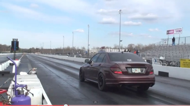 Heavy Duty Parts für Kolben und Nockenwellen und die Optimierung des Ansaugtrakts nebst Software-Modifikaktion erbrachten eine Leistungssteigerung auf 652 PS. Und dann wird der Benz ja auch noch von einem NOS-System nach vorn katapultiert. Wird das Nitro zum richtigen Zeitpunkt in die Brennräume geleitet, stehen dem Mercedes AMG satte 250 zusätzliche PS zur Verfügung. Mit der geballten Power von 900 Pferdestärken brauchte der C 63 AMG die Zeit von 10.41 Sekunden für die Quartermile. Ein neuer Rekord war geboren - für Serienfahrzeuge mit Straßenzulassung. Für die Beschleunigung von 0-100 km/h benötigte der C 63 AMG nur 3,1 Sekunden. Die Marke von 200 km/h war nach 9,63 Sekunden ducheilt. Als der Mercedes über die Ziellinie der Viertelmeilendistanz schoss, hielten die Meßgeräte eine Geschwindigkeit von 217,26 km/h fest. Wer Augenzeuge der Rekordfahrt werden will, kann sich das Video anschauen. Und wer noch dazu Ohrenzeuge dieses Ereignisses sein möchte, macht bitte die Lautsprecher seines PC ein bisschen lauter - der Sound des Mercedes C63 AMG ist nämlich die Wucht in Tüten!
