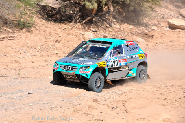 Die Mercedes-Präsenz auf der diesjährigen Dakar ist beschränkt auf einen holländischen Unimog, unseren GLE 400 und zwei Mercedes-Prototypen, die von Colcar in Eigenregie entwickelt und gebaut wurden. Colcar ist der größte argentinische Mercedes-Händler und in den Venen fließt echtes Men-In-Benz-Herzblut. Ihr ML-Prototyp (rechts neben unserem Mercedes-Benz GLS 400, mit dem wir die Dakar Rally begleiten. Foto lässt sich zwecks Vergrößerung anklicken.)) ist möglicherweise sogar europäischen Rallye-Fans bekannt, der GLA-Prototyp, der uns uns im Video von Martin Maldonado vorgestellt wird, ist dagegen eine Neuentwicklung und startet erstmals bei der Dakar Rallye.