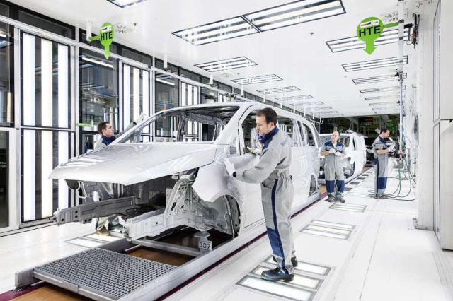 Trotz aller Sorgfalt: Im Anschluss an den Decklack-Auftrag wird auf der weißen Platte gründlich kontrolliert. Hier stehen die frisch lackierten Transporter auf hellem Untergrund. Gleißendes Licht leuchtet die Karosserie bis in die kleinste Fuge aus. Erfahrene und geschulte Mitarbeiter kontrollieren mit scharfem Auge die Qualität, prüfen die Oberfläche der Karosserien auch manuell mit behandschuhten Händen.
