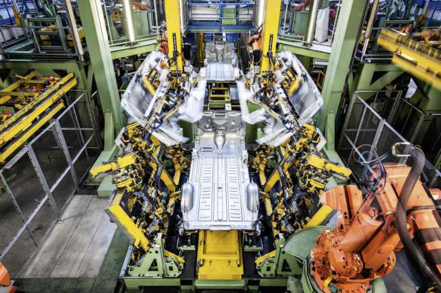 Neu eingerichtet ist die Framing-Station. Hier werden Seiten, Boden und Dachträger miteinander verbunden. Aus den zuvor gefertigten Blechteilen entsteht die Karosserie im Rohbau wird auch von Hochzeit gesprochen. Sechs Roboter sind an dieser komplexen Arbeit beteiligt.
