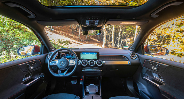 Von innen wird der EQB dann zum spektakulären zweiten Familienwohnzimmer auf vier Rädern. Im Innenraum verweisen seine Rohrelemente in Aluoptik an den Innengriffen, der Tür, der Armaturentafel und der Mittelkonsole abermals auf den starken Nutz-Charakter. Andeutungen auf das elektrische Gemüt spiegeln sich, je nach Ausstattung, im eindrucksvolle Zierteil auf dem Armaturenbrett, die Akzente auf den Sitzen, dem Fahrzeugschlüssel und sogar an den beleuchteten Lüftungsdüsen wider. Die für ein Elektroauto typischen Anzeigen greifen das Farbkonzept des Interieur-Designs in entsprechend gefärbten Elementen wieder auf. Die Sportlichkeit des EV wird durch eine High-Tech-Turbinen-Optik angedeutet. Wie gewohnt begrüßt uns das MBUX-System, das wir schon aus dem GLB kennen, nun aber mit an das EV angepassten Elementen. So lassen sich im Media-Display über das Mercedes-EQ-Kachel-Menü Ladeoptionen, Stromverbrauch und Energiefluss aufrufen. Alles in allem ein sehr beeindruckend gelungener Innenraum, der einige Innenräume der letzten drei Jahre buchstäblich alt aussehen lässt!