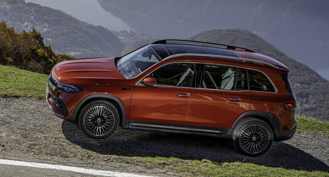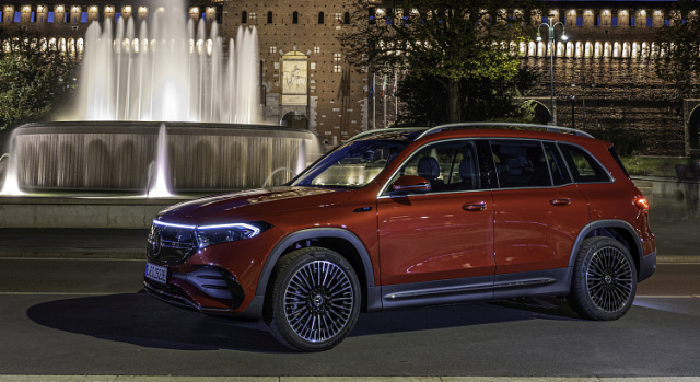 Auch von der Seite zeigt sich der EQB von seiner besten Seite, dominiert wird diese nämlich von den breiten Kotflügen, die an eine muskulöse Schulter erinnern. Dieser Eindruck wird durch die ansteigende Scheibenkante nochmals verstärkt. Insgesamt wirkt der EQB trotz seiner Gesamtlänge von über 4,5 Metern sehr ausbalanciert, was den kurzen Überhängen an Front und Heck zu verdanken ist. Das Greenhouse ist funktionsorientiert und die geständerte Dachreling unterstreicht die hohe Nutzbarkeit des neuen EQB.