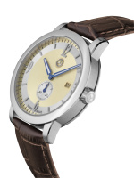 „Classic Steel“ heißt eine elegante Herren-Armbanduhr im modischen Vintage-Look. Das Gehäuse aus Edelstahl mit überstehendem Boden und überstehender Lünette harmoniert mit dem silbern/beigen Zifferblatt. Applizierte Indexe und Ziffern, ein historischer Mercedes Stern sowie silberfarbene Leuchtzeiger runden die Optik ab. Für einen angenehmen Tragekomfort sorgt das braune Kalbslederband mit Krokoimitat-Prägung und Dornschließe. Die Uhr (Durchmesser ca. 42 mm) besitzt das Quarzwerk Ronda 6004.D. Elegant-technoid ist das Design der Manschettenknöpfe Schaltrad aus Edelstahl: Die runde Oberseite besitzt eine schwarze Epoxyharz-Einlage und eine seitliche Rändelstruktur. Das kleinere Gegenstück des Knopfes weist einen Mercedes Stern auf.