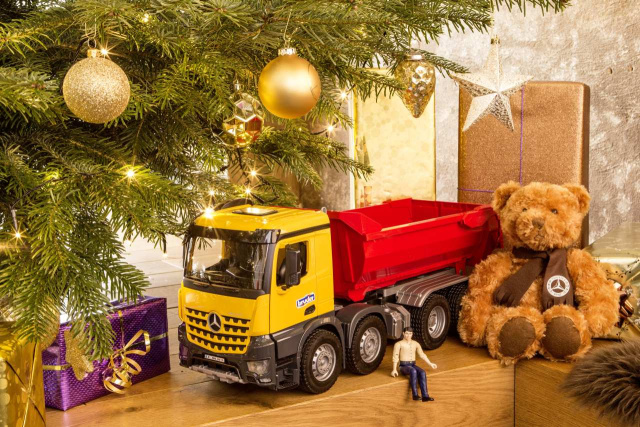 Am Spielzeugmodell Arocs 8x4 Halfpipe Baukipper haben kleine Bauarbeiter ihre Freude. Das Baustellenfahrzeug ist anhand der Original-CAD-Daten im Maßstab 1:16 aus Kunststoff gefertigt und wird aus über 50 Einzelteilen von Hand montiert. Die Länge beträgt rund 70 cm, die Türen lassen sich öffnen. Der Baukipper hat ein gelbes Fahrerhaus. Die rote Wanne verfügt über eine Kippfunktion: Ein dreifach ausziehbarer Zylinder mit Rastfunktion erlaubt verschiedene Spielsituationen. Das von Bruder Spielwaren für Mercedes-Benz hergestellte Modell ist für Kinder ab drei Jahren geeignet.