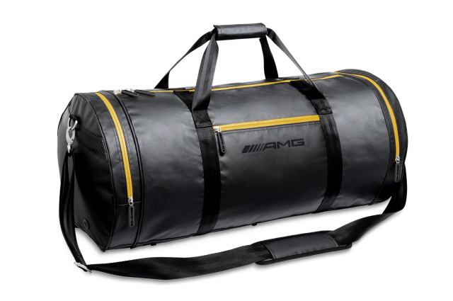 Gleichermaßen sportlich wie praktisch präsentiert sich die Sport- und Reisetasche AMG GT (Zirka-Maße: 67 x 35 x 35 cm). Die in der Farbe Anthrazit erhältliche Tasche, die aus PVC gefertigt wurde, ist robust und widerstandsfähig. Ausreichend Stauraum bieten sowohl ein Hauptfach mit kleinem Innenfach als auch zwei Außentaschen. Für besonderen Tragekomfort sorgen zwei Trageriemen aus Gurtmaterial sowie ein abnehmbarer, gepolsterter Schultergurt. Optisch setzt die Sport- und Reisetasche AMG GT besondere Akzente durch Reißverschlüsse in der Farbe AMG Solarbeam Gelb, einen schwarzen AMG Logodruck auf der Frontseite sowie einen schwarzen GT Logodruck an der Seite.
