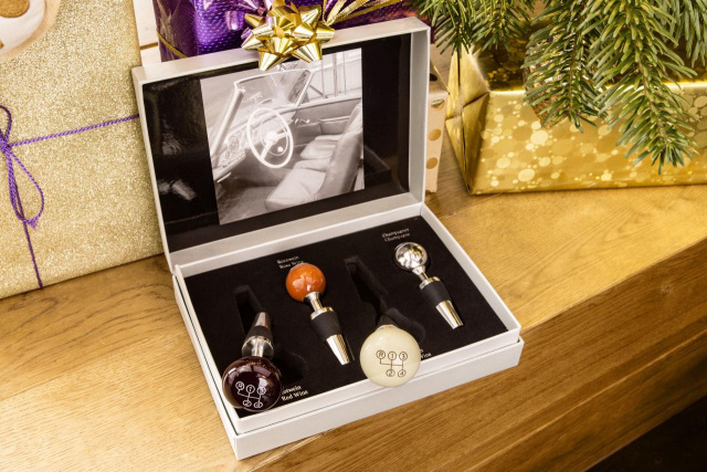 Den Schaltknauf des Sportwagen-Klassikers 300 SL haben die Weinverschlüsse „Classic“ als Designvorbild. Drei der Köpfe bestehen dabei aus lackiertem Holz, einer aus Edelstahl. Das 4er-Set wird in einer Geschenkbox geliefert (Maße: ca. 21,5 x 15,5 x 5,5 cm).