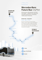 Seine erste Fahrt in der Öffentlichkeit absolviert der Mercedes-Benz Future Bus mit CityPilot auf einem Teilstück der längsten BRT-Linie Europas (BRT = Bus Rapid Transit) in den Niederlanden. Sie verbindet den Flughafen Amsterdam Schiphol mit der Stadt Haarlem. Die knapp 20 km lange Strecke bedeutet für den Mercedes-Benz Future Bus eine echte Herausforderung: Sie ist kurvenreich, führt durch Tunnels und über Ampelkreuzungen.