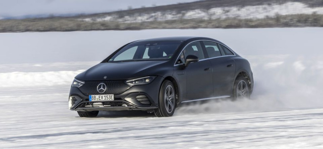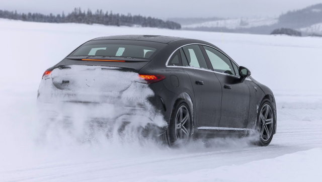 Die Hinterachslenkung, die die Räder mit einem Winkel von maximal 4,5 Grad einschlägt, hilft bei der Dynamik und dem neutralen Fahrverhalten, das sich auch bei einem schnellen Spurwechsel auf dem glatten Untergrund manifestiert. Jetzt schalten wir in den Comfort-Modus und die Elektronik legt dem bewegungsfreudigen Heck sofort straffere Zügel an. Die Regeleingriffe sind geschmeidig und halten die über zwei Tonnen schweren Limousine auch bei der spiegelglatten Oberfläche souverän in der Spur. Der Ingenieur neben mir nickt zufrieden. So hat er sich das vorgestellt. Aber noch wäre Zeit, an den Prototypen etwas zu verändern. Das Sport-Fahrprogramm wird seinem Namen gerecht und lässt größere Driftwinkel zu. Am Kurvenausgang stellt man das Auto gerade und mit einem beherzten Einsatz des rechten Pedals zieht der Allradantrieb den tonnenschweren Stromer auf die nächste Gerade. Wenn die Regelsysteme schon auf Eis so zuverlässig agieren, wird es auf Asphalt nur wenig Probleme geben. Allerdings ist auch beim EQE 500 4MATIC schon bei 210 km/h Schluss. Wer 30 km/h schneller unterwegs sein will, muss zu den AMG-Varianten greifen.