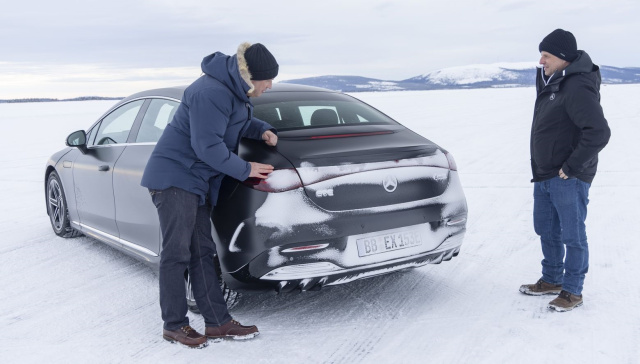 Mercedes verpasst dem EQE im nordschwedischen Arjeplog den letzten Schliff. Die Prototypen müssen nicht nur heftigen Minusgraden trotzen, sondern auch auf spiegelglatten Eisflächen beherrschbar bleiben. Der EQE 500 4MATIC beherrscht beide Disziplinen.