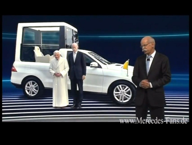 Auf der Detroit Auto Show präsentierte sich die Marke Mercedes-Benz in jederlei Hinsicht Bestform. Daimler-Vorstandsvorsitzender Dr. Zetsche trug seine Präsentationen der neuen E-Klasse und der neue CLA Klasse selbsbewusst, charmant und kurzweilig vor. Dass "Dr. Z." Humor hat, bewies er gleich zu Anfang seiner Präsentation des neuen Mercedes CLA, als er ausführte, dass 2013 ein großartiges Jahr für Mercedes-Benz werden würde. Er sagte (ins Deutsche übersetzt, im Video ab Spielzeit 0:16): " Unsere neue G-, GLK- und GL-Klasse verkaufen sich wie geschnitten Brot. Das gleiche gilt für unsere M-Klasse. Hier ist einer der glücklichen Kunden, der das bezeugt." (Im Hintergrund wird auf der Projektionswand ein Bild von Papst Benedikt XVI. mit seinem neuen Mercedes-M-Klasse-Papamobil eingeblendet - Heiterkeit im Publikum). Klarer Fall von charmenter Witzigkeit. Schön zu sehen, dass man im Hause Daimler zum Lachen nicht in den Keller, sondern zuweilen auch auf die große Bühne geht.